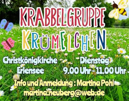 Es wuselt, krabbelt und lacht wieder jeden Dienstag zwischen 09:00 und 11:00 Uhr in der Pfarrgemeinde. Wie schön, dass die Krümelchen zusammenkommen, um so den Eltern mit ihren Kindern (0 – 3 Jahre) die Möglichkeit zu geben, einen Vormittag lang sich auszutauschen, zur Ruhe zu kommen und so den Alltag `mal hinter sich zu lassen, zu spielen und Kontakte zu knüpfen. Fragen und Anmeldungen an Frau Martina Pohl. Tel: 06183/9299785 oder Handy: 0173/7546597. Wir freuen uns immer auf neue Krümelchen im Norbert-Weidlich-Haus im Raum Elisabeth.